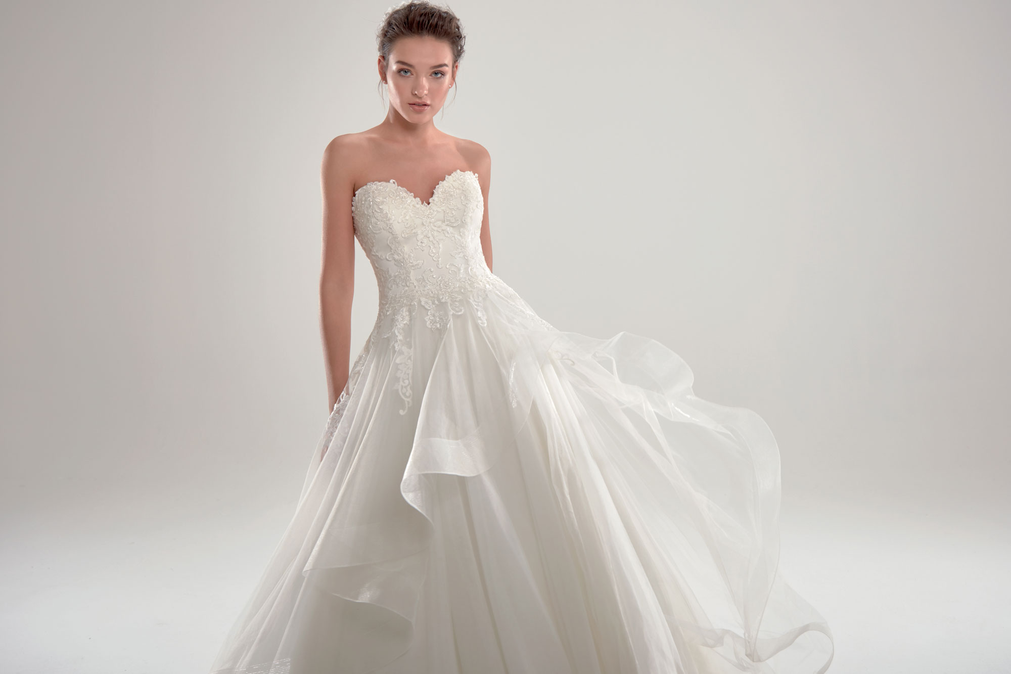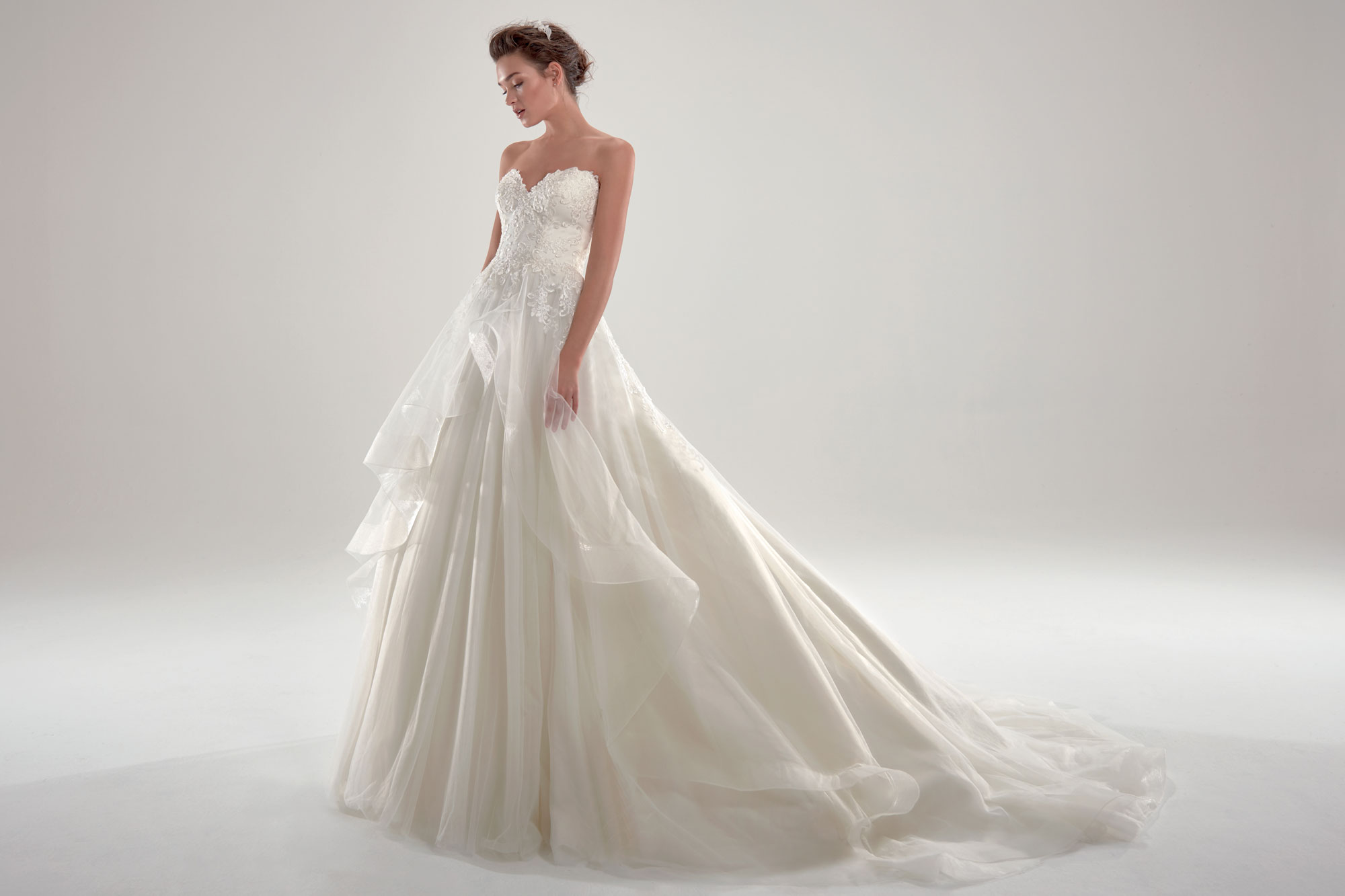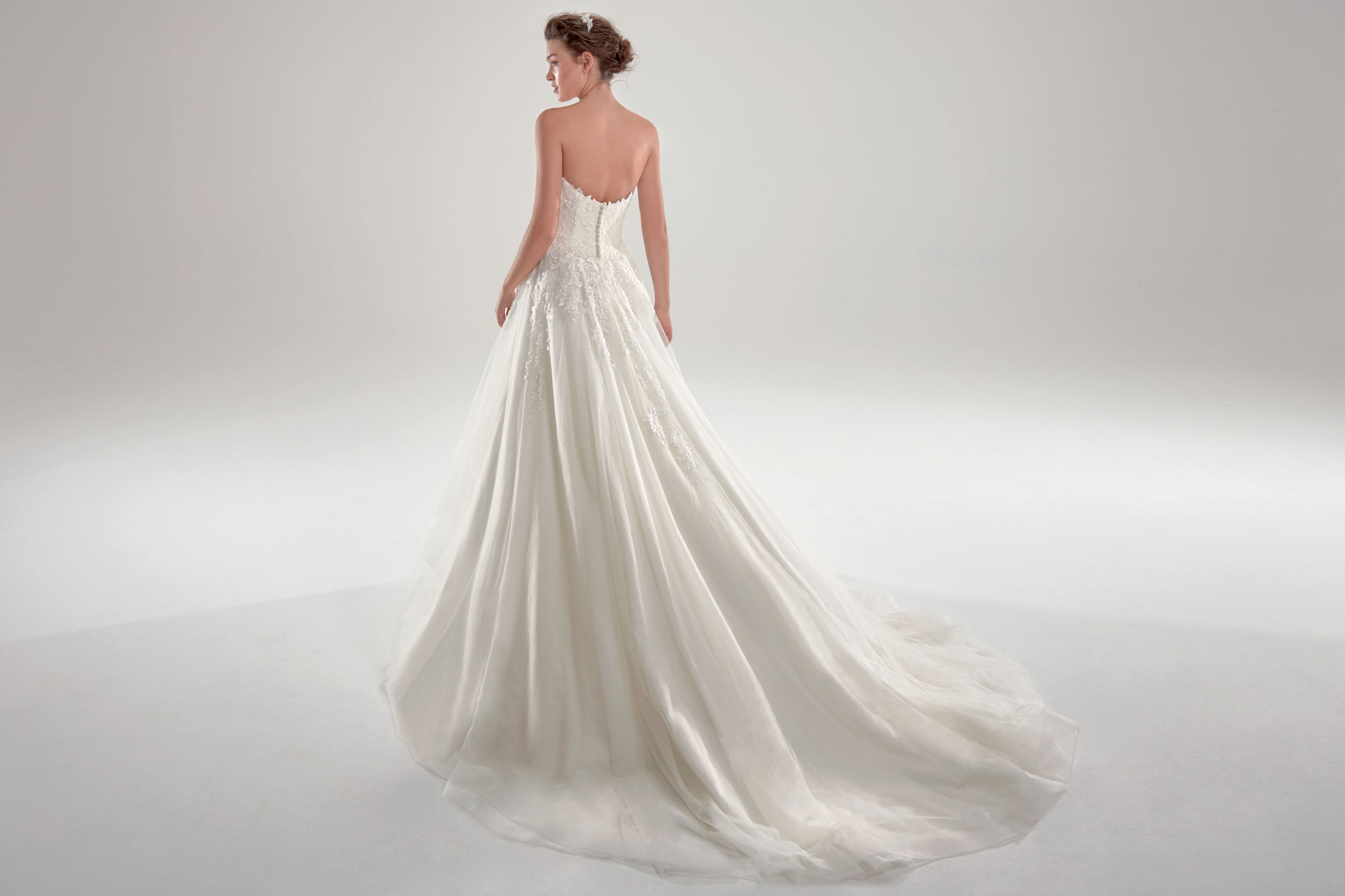 Uno splendido strascico e impalpabili balze rendono la gonna in tulle indimenticabile.