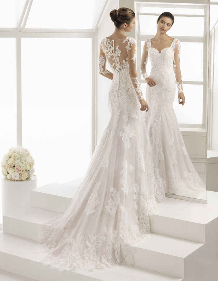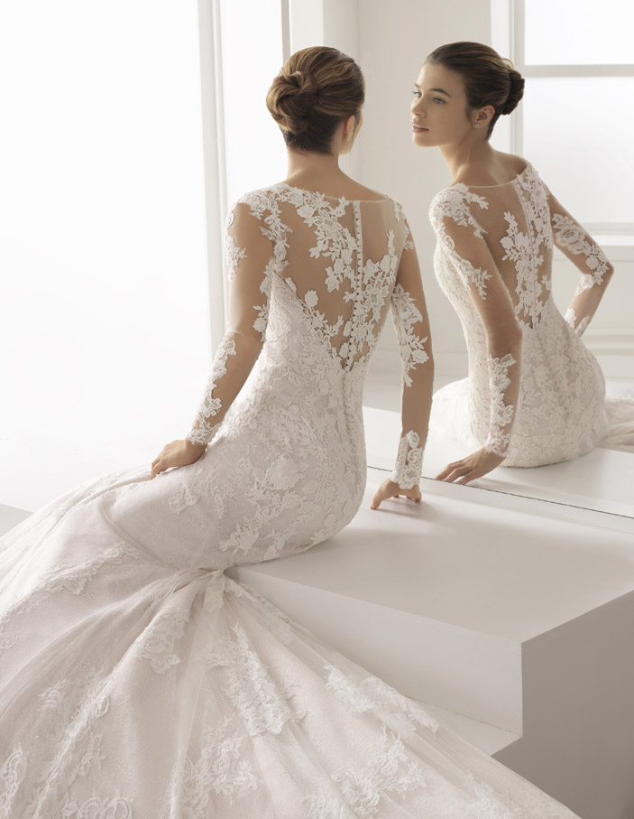 In questo abito il taglio a sirena è arricchito da un romantico scollo a cuore e applicazioni in pizzo. Vero punto focale di questa splendida creazione è la schiena vestita di tulle cristallo e applicazioni di guipure, un prezioso ricamo a rilievo realizzato con fili di seta. Ne risulta un sofisticato e sorprendente effetto tatuaggio riportato anche sulle maniche.