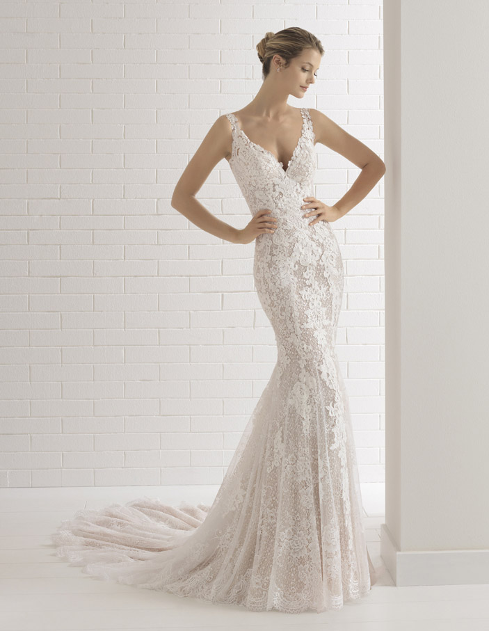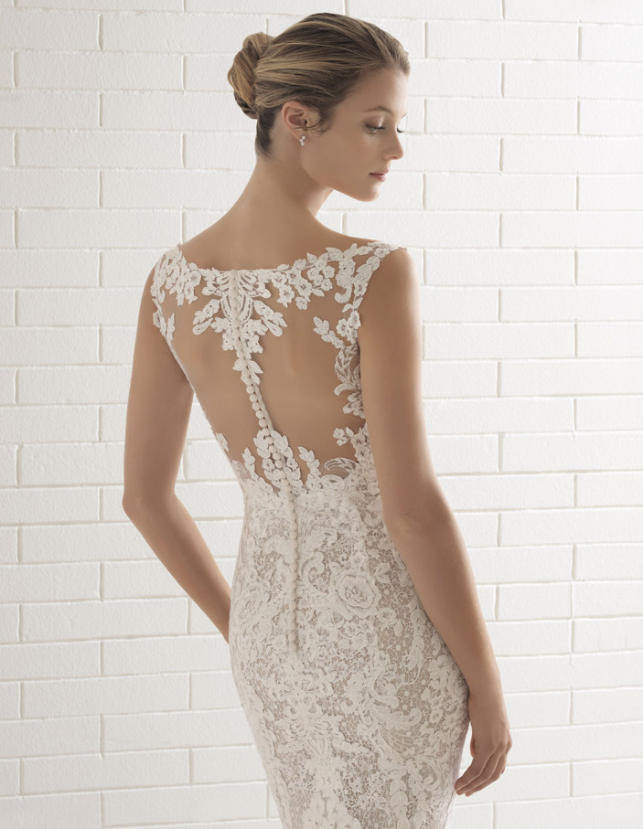 Una preziosa lavorazione in pizzo che aderisce alle naturali linee della silhouette. A completare l’opera un profondo scollo a “V” e la schiena incorniciata da una delicata lavorazione in pizzo e tulle con effetto tattoo. Pura seduzione.