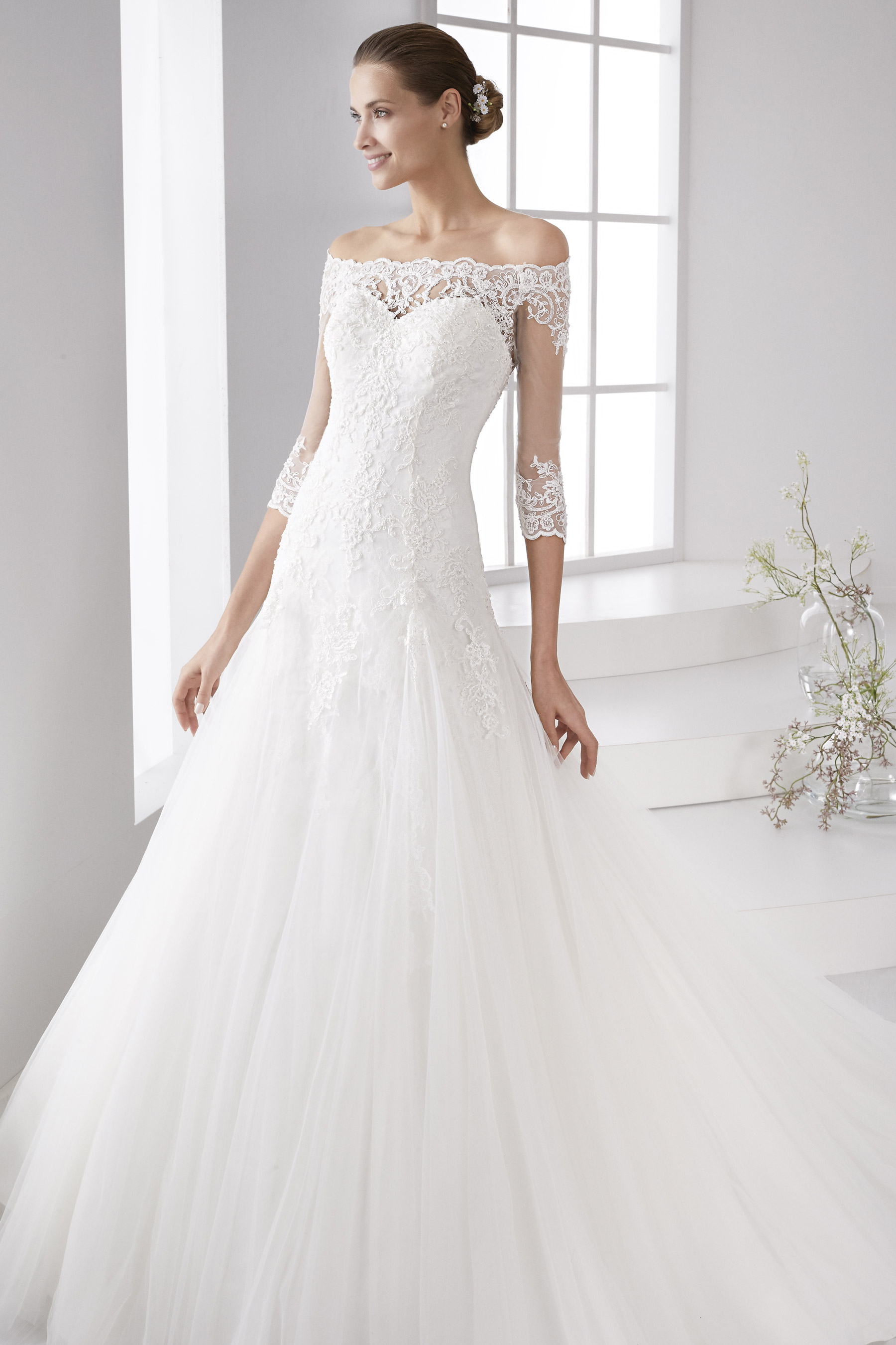 Un abito da sposa redingote, reso indimenticabile da una splendida transizione tra il pizzo e il morbido tulle. Le maniche a tre quarti e il raffinato effetto tattoo evocano uno stile romantico e principesco.