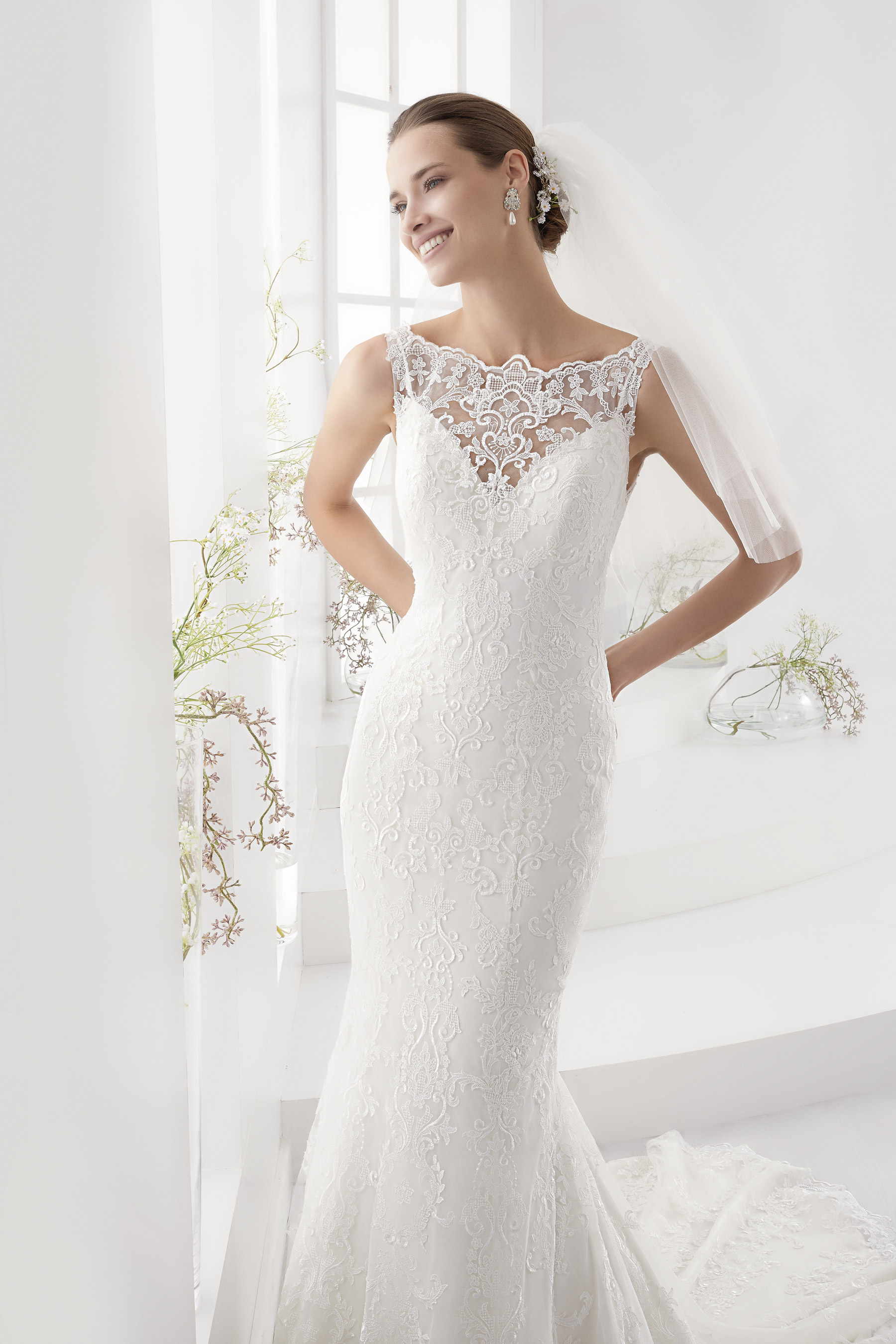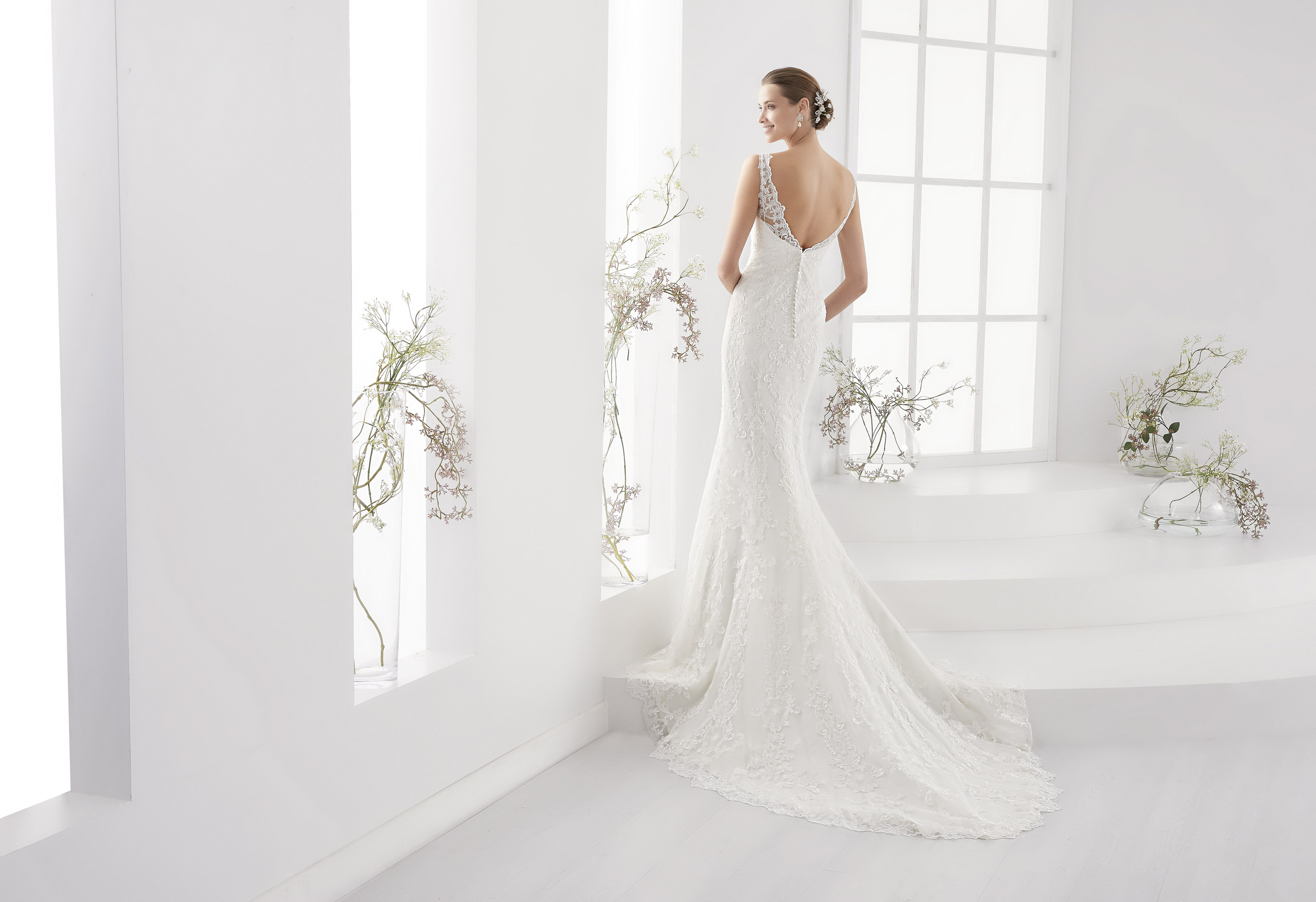 Uno splendido modello a sirena caratterizzato da un fitto ramage in pizzo rebrodè che attraversa l’intero abito e culmina in una raffinata lavorazione sul décolleté che impreziosisce il profondo scollo a “V”.