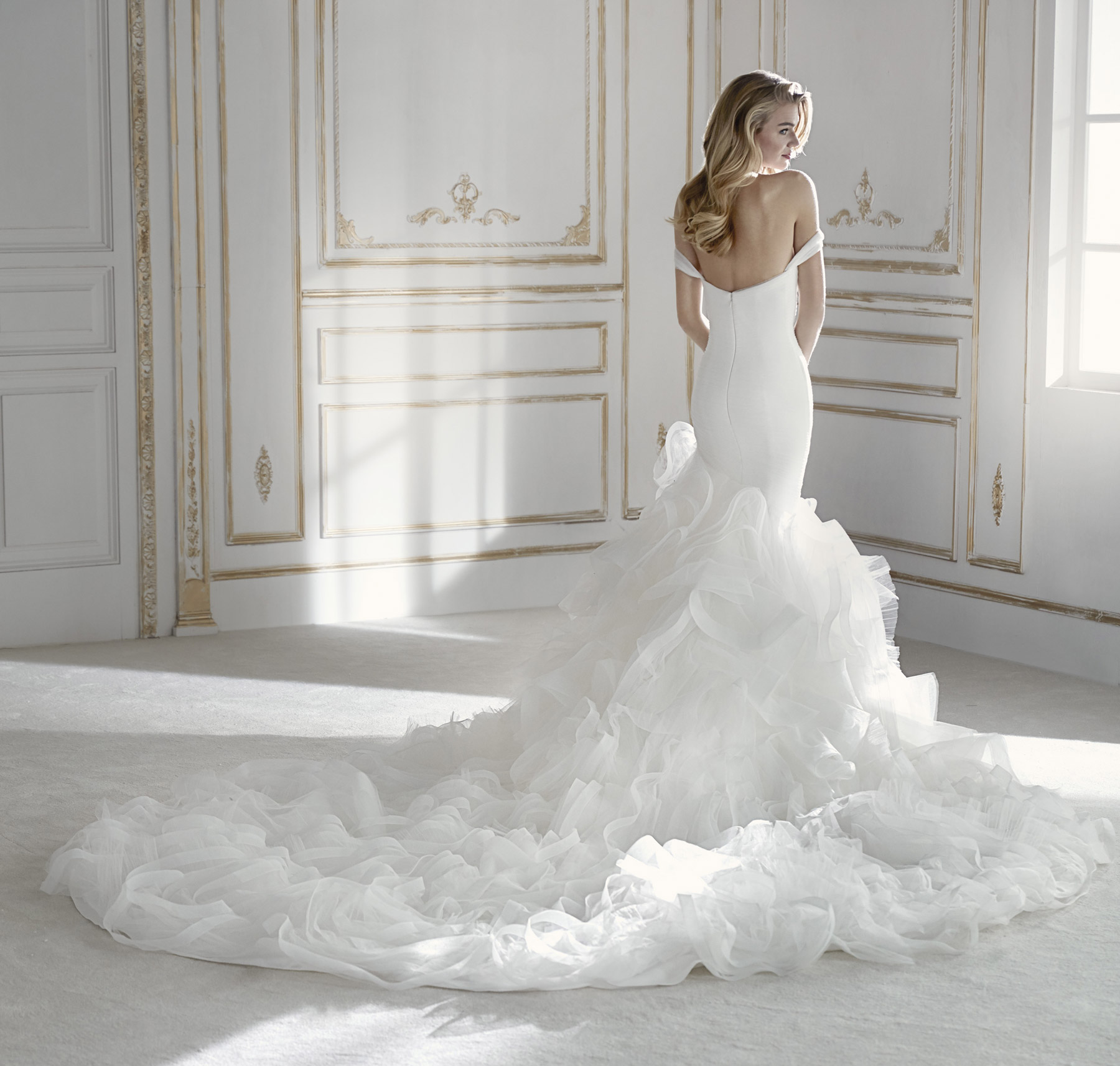 Un grandioso modello a sirena con scollatura a cuore ed eleganti giochi di tulle che culminano in un maestoso strascico con volant.