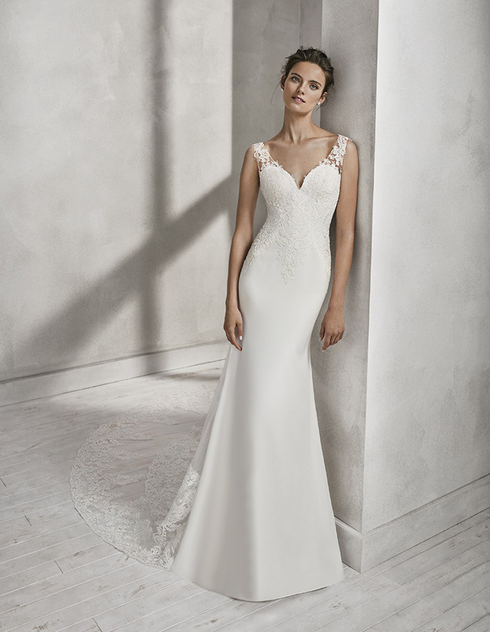 Un abito a sirena in crêpe di seta che definisce splendidamente la silhouette. Corpetto e schiena sono impreziositi da una finissima lavorazione in pizzo che culmina poi in un sontuoso strascico a tre livelli.