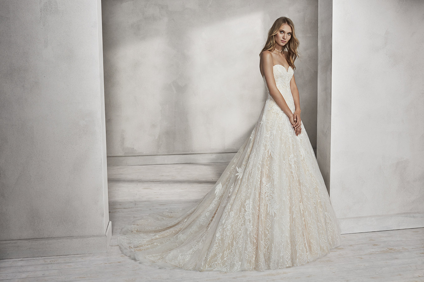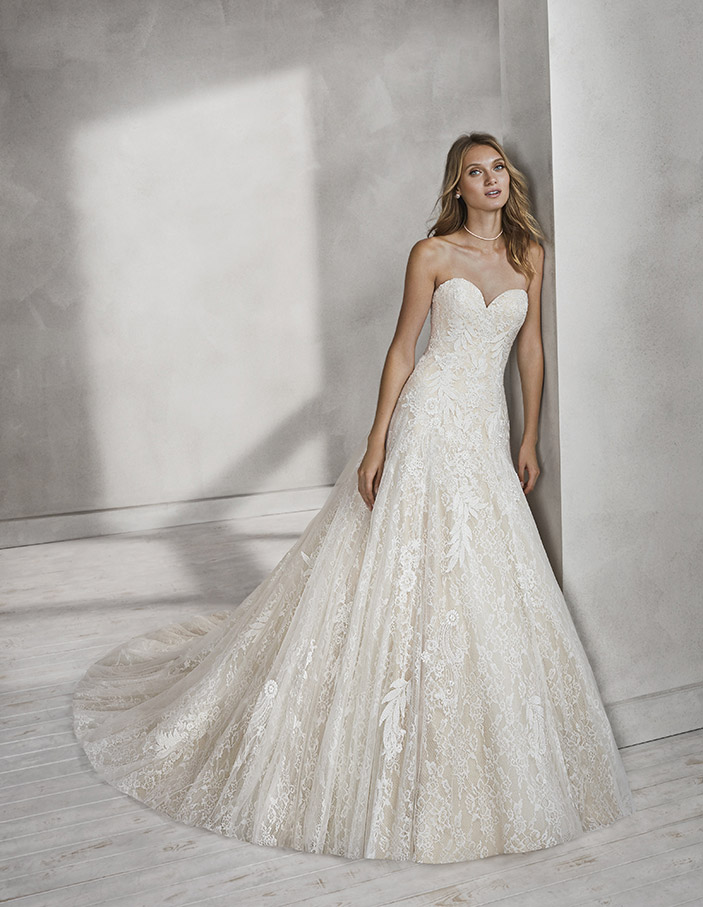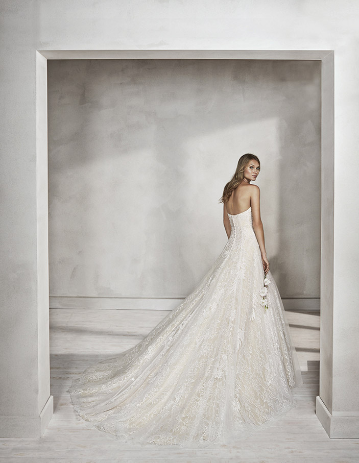 Un abito maestoso interamente rivestito da due differenti tipologie di pizzo. Il primo si caratterizza per una trama fitta e delicata, il secondo per una lavorazione con motivi più ampi e in rilievo.